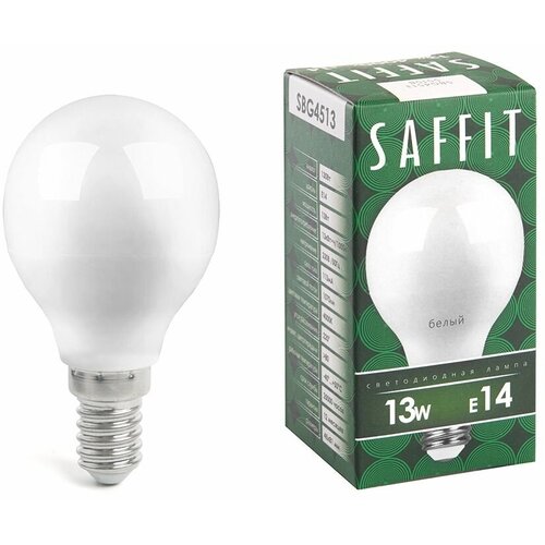 Лампа SAFFIT SBG4513 имеет форму шара и цоколь E14, что обеспечивает ее легкую установку и совместимость с большинством светильников. Мощность лампы составляет 13 Вт, что эквивалентно лампе накаливания мощностью 130 Вт.