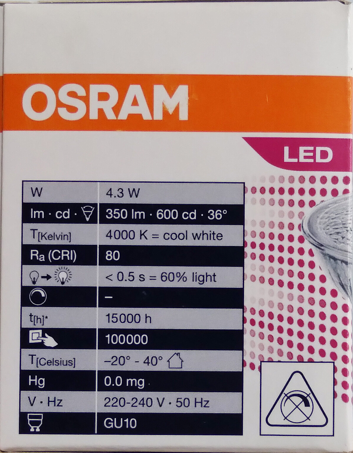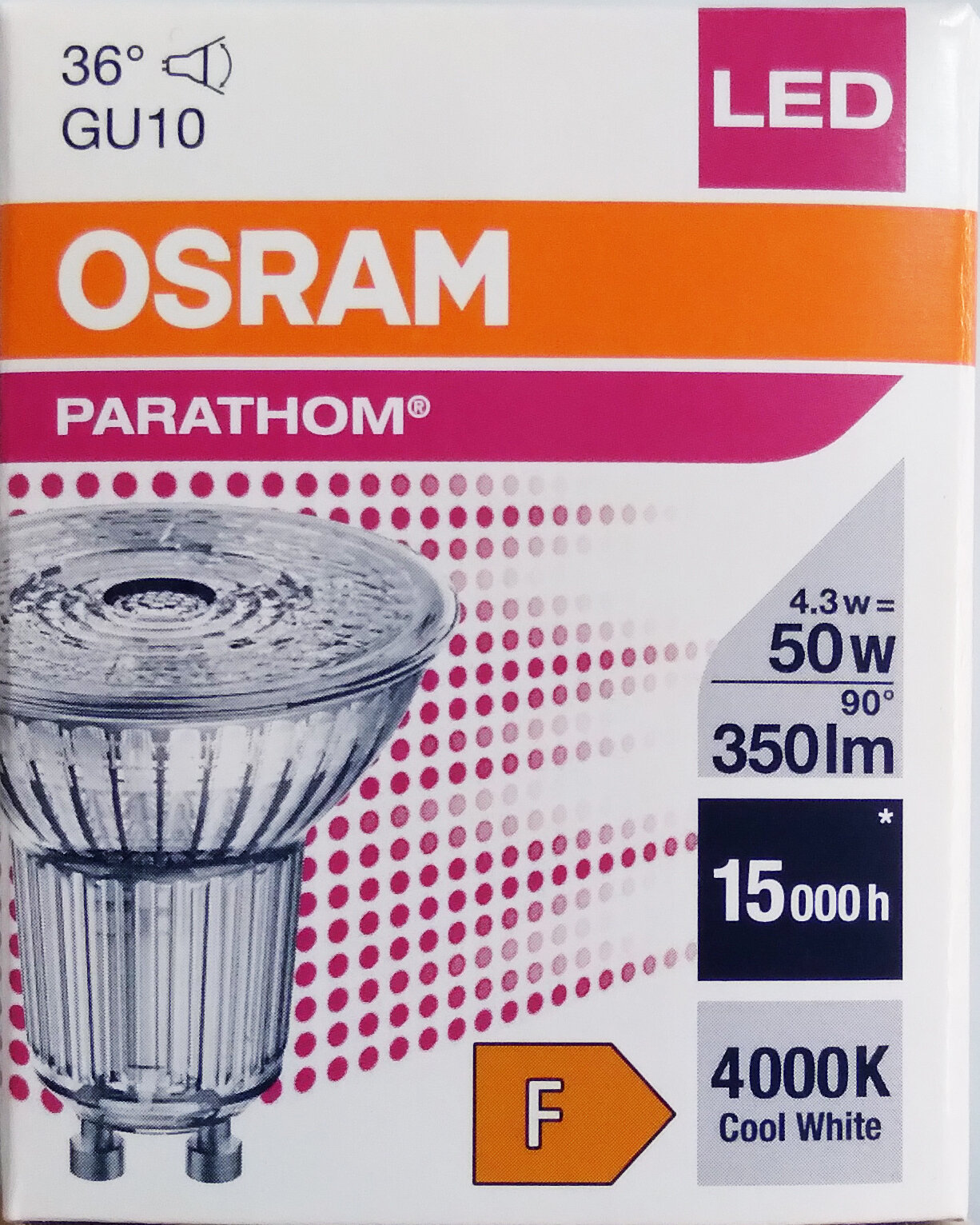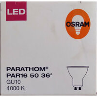 Купить 5шт/уп. Лампа LED Софит 4.3Вт 220-240В GU10 PAR16 350Лм 4000К Угол 36 град. d 50mm h 52mm Свет Дневной белый Osram, уп. 5шт с доставкой по всей России.