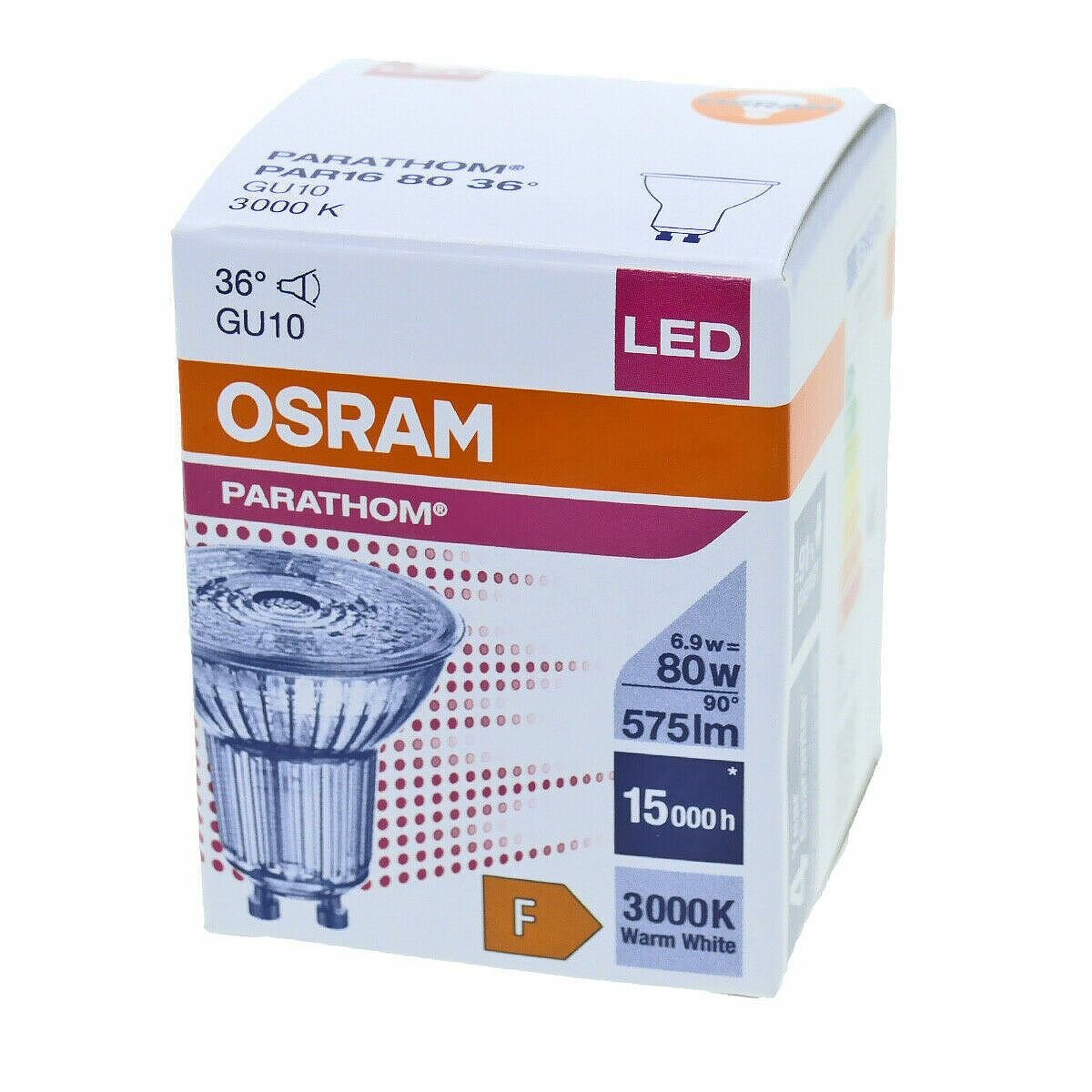 Лампа светодиодная OSRAM Parathom PAR51, 575лм, 6,9Вт (замена 80 Вт), 3000К (теплый белый свет). Цоколь GU10, колба PAR51, угол пучка 36°. Исполнение колбы прозрачное, стекло.