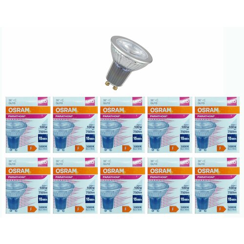 Лампа светодиодная OSRAM Parathom PAR16, 750лм, 9,6Вт (замена 100 Вт), 3000К (теплый белый свет). Цоколь GU10, колба PAR16, угол пучка 36°. Исполнение колбы прозрачное, стекло.