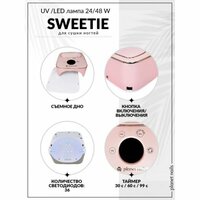 Характеристика: - количество светодиодов: 36 шт. - мощность: 24/48 Вт. - таймер: 30, 60 и 99 сек. - сенсор - цифровой дисплей - режим "Low Hard Mode" - режим постепенного нагрева - съемное дно - тип питания: 24 В через адаптер от сети 220 В - срок службы светодиодов: 50 000 часов Профессиональная UV/LED лампа для маникюра Sweetie 48W 10343 Planet nails белая арт.10343
