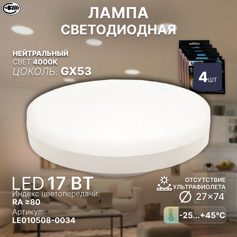 Лампочка GX53L, Нейтральный белый свет, GX53, 17 Вт, Светодиодная, 4 шт. Лампа с/д LEEK LE SPT 17W 4K GX53 (100): сравнение цен, характеристики, фото, актуальное наличие и цены.