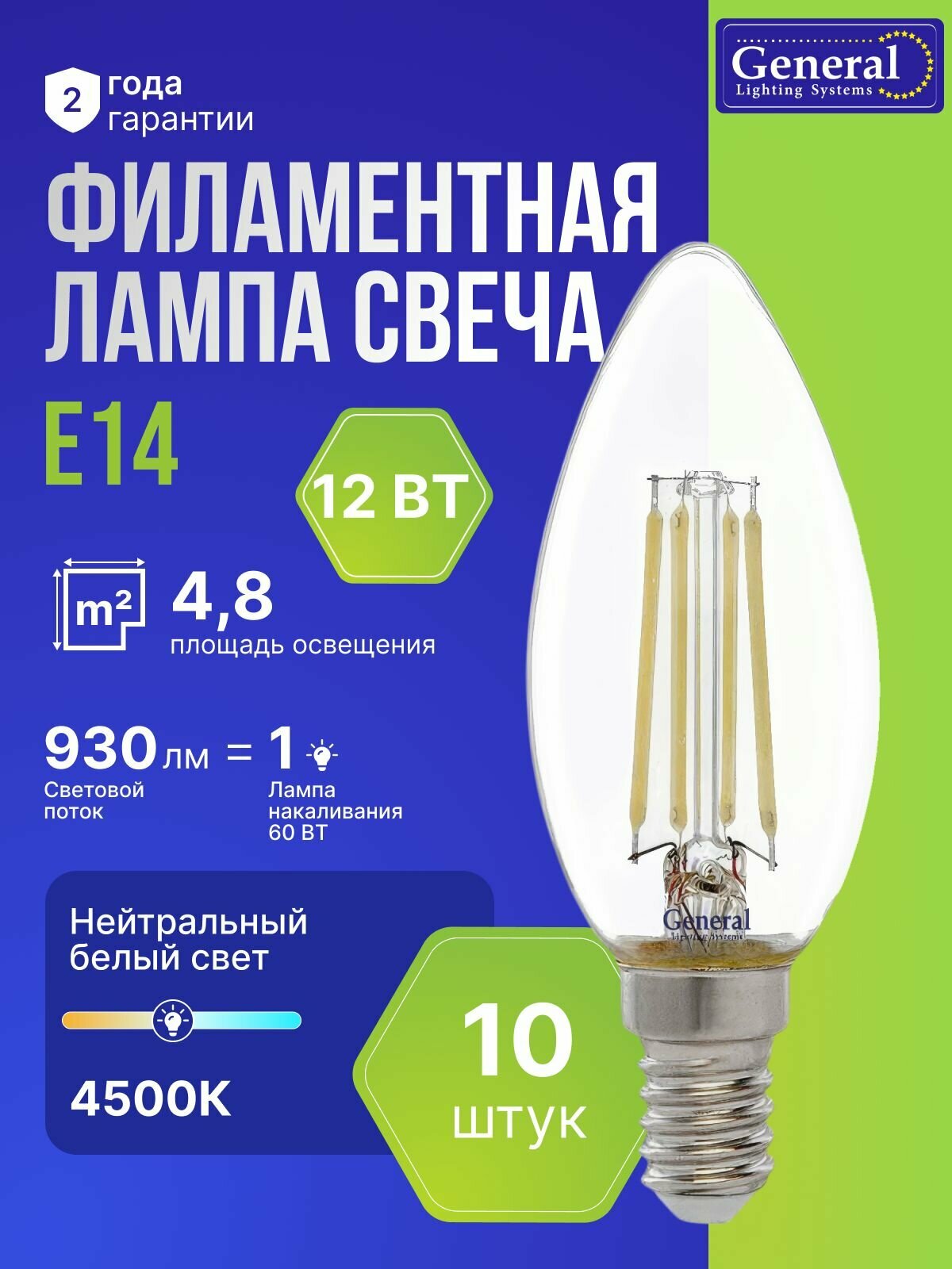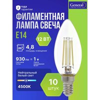 Европейское качество напрямую от производителя - General Lighting Systems! Прозрачные светодиодные лампы серии Филамент от бренда General (Генерал) – универсальное решение для любого дизайна и максимально возможная ширина ассортимента и выбора для любого покупателя. Прозрачные светодиодные лампы серии Филамент от бренда General Lighting Systems – универсальное решение для любого дизайна. В упаковке содержится выгодный по всех смыслах набор из 10 штук, 12 ваттных лампочек, что обеспечит вас надежным и долговечным освещением на длительный срок. Яркость (световой поток) = 930 люменов. Повышенная светоотдача позволяет получить тот же световой поток при меньших значениях потребляемой мощности (Вт.). Филаментные лампы представляют собой разновидность светодиодных ламп, имитирующих традиционные лампы накаливания. Внутри колбы расположены тонкие светодиоды, создающие эффект нити накала. Прозрачная стеклянная колба делает их особенно привлекательными для использования в люстрах, бра и других светильниках, где важна эстетика освещения. Лампы филамент сочетают в себе как элементы классического стиля, так и детали модерна. Элегантный внешний вид ламп в форме свечи делает их привлекательными даже в выключенном состоянии. Особенно выгодно прозрачный филамент будет смотреться в хрустальных люстрах. Благодаря широкому углу рассеивания 360° – свет будет играть на всех гранях стекла и переливаться разными цветами. Дневной белый свет с температурой 4500K создаёт максимально комфортную атмосферу с ярким и ясным цветом, что отлично подходит как для рабочих, так и для жилых пространств, включая кухни, ванные комнаты, спальни и офисы. Филамент подходят для использования в спальнях, кафе, ресторанах и других общественных местах. Подходит для выключателей с подсветкой. Простота установки LED лампы благодаря стандартному цоколю Е14 обеспечивает удобство использования в любом из ваших светильников. Легкая установка и высокая степень надежности делают использование этих ламп очень удобным и практичным. Диапазон рабочего напряжения 200 - 265В. Высокий индекс цветопередачи ≥ 80. Лампочка мощностью 12 Ватт потребляют на 90% меньше электроэнергии, что позволяет существенно снизить затраты на электроэнергию. Энергосберегающие лампочки не только экономят электроэнергию, но и имеют долгий срок службы 30 000 часов. Произведены в полном соответствии с европейскими стандартами качества. Весь производственный процесс осуществляется исключительно на автоматизированных сборочных линиях, что гарантирует исключение ошибок, возможных при ручной сборке. Используемые компоненты отличаются премиальным качеством, обеспечивая надежность и долговечность продукта. Филаментные лампы, в отличие от люминесцентных ламп, не содержат ртути и не выделяют вредных веществ, что делает их абсолютно безопасными для здоровья и окружающей среды, способствуя тем самым сокращению выбросов углекислого газа и уменьшению экологического следа. Выбирая энергосберегающие лампочки, вы делаете шаг к более экологичному освещению. Диодные лампы не только функциональные, но и стильные, что позволяет дополнить интерьер любого современного помещения. С таким набором сможете легко оснастить множество светильников в доме или офисе, а также применять в декоративных решениях. Лед лампы в наборе обеспечивают отли