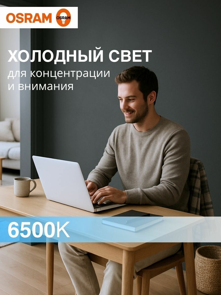 Холодный белый свет 6500К эффективен для повышения концентрации внимания, улучшения настроения и повышения производительности. Стимулирует умственную деятельность, помогает сосредоточиться и настроиться на работу, а также замедляет выработку мелатонина. Повышает бдительность, бодрит и заряжает энергией.