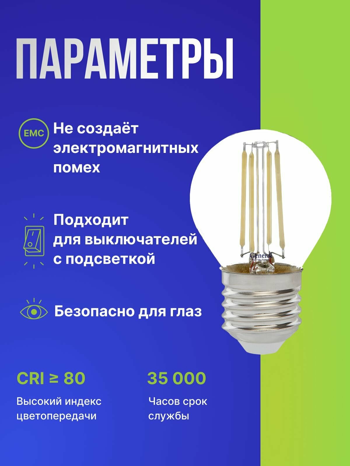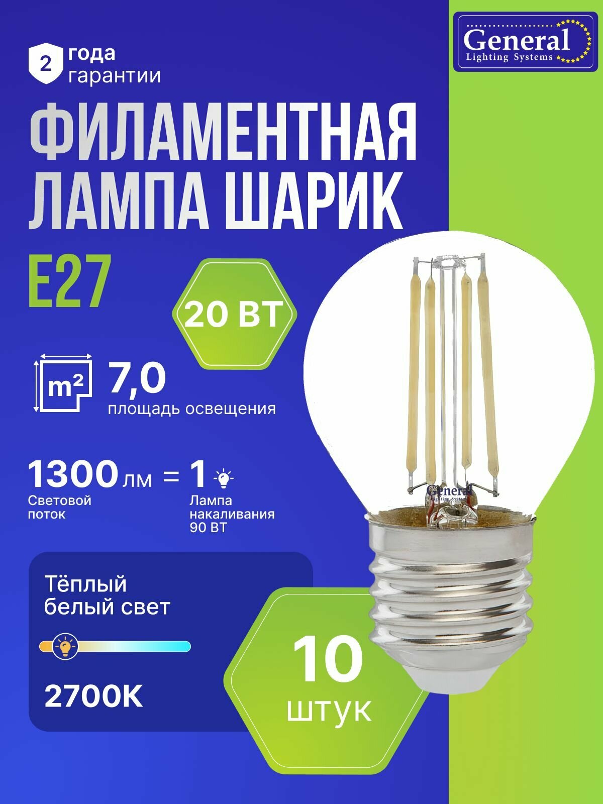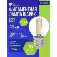 Лампочка светодиодная Е27: набор 10 штук филаментная прозрачная, мощный световой поток 1300 лм. (люмен) энергоэффективн. led серия 20 Вт. теплый белый 2700К General лампа-шар, напрямую у производителя: сравнение цен, характеристики, фото, актуальное наличие и цены.