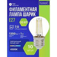 Лампочка светодиодная Е27: набор 10 штук филаментная прозрачная, мощный световой поток 1350 лм. энергоэффективная led серия 20 Вт. дневной белый 4500К General лампа-шар, напрямую у производителя: сравнение цен, характеристики, фото, актуальное наличие и цены.