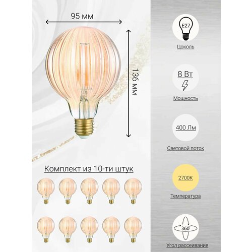 Лампочка светодиодная филаментная, General, Комплект из 10 шт, 8 Вт, Цоколь E27, 2700К, Форма лампы Шар, G95S: сравнение цен, характеристики, фото, актуальное наличие и цены.