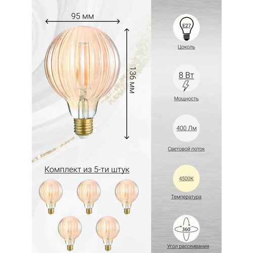 Лампочка светодиодная филаментная, General, Комплект из 5 шт, 8 Вт, Цоколь E27, 4500К, Форма лампы Шар, G95S: сравнение цен, характеристики, фото, актуальное наличие и цены.