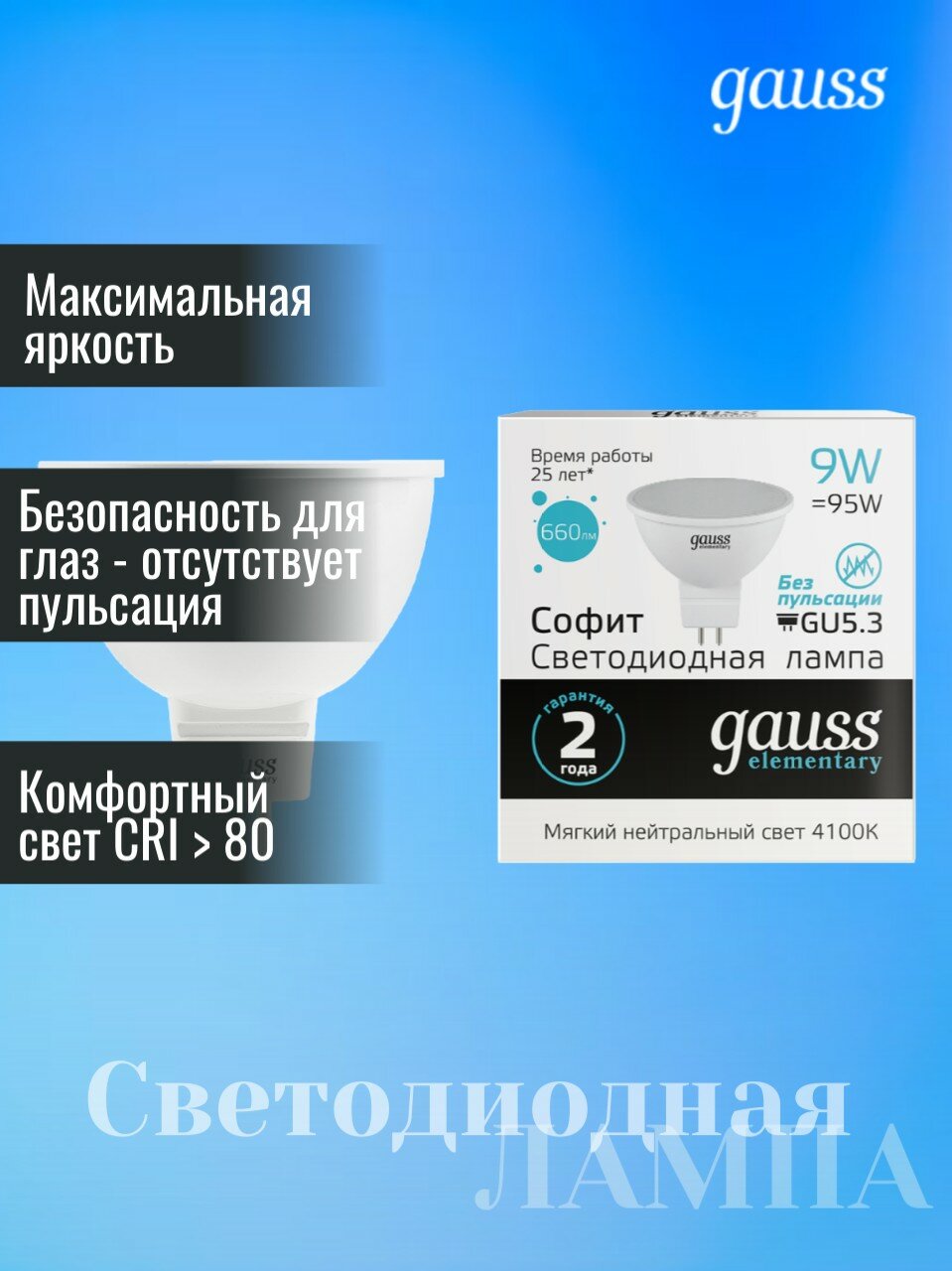 Лампочка светодиодная Gauss Elementary 9Вт, 4100K, 660Лм, GU5.3, для спотов MR16 софит (комплект из 2 шт.): сравнение цен, характеристики, фото, актуальное наличие и цены.