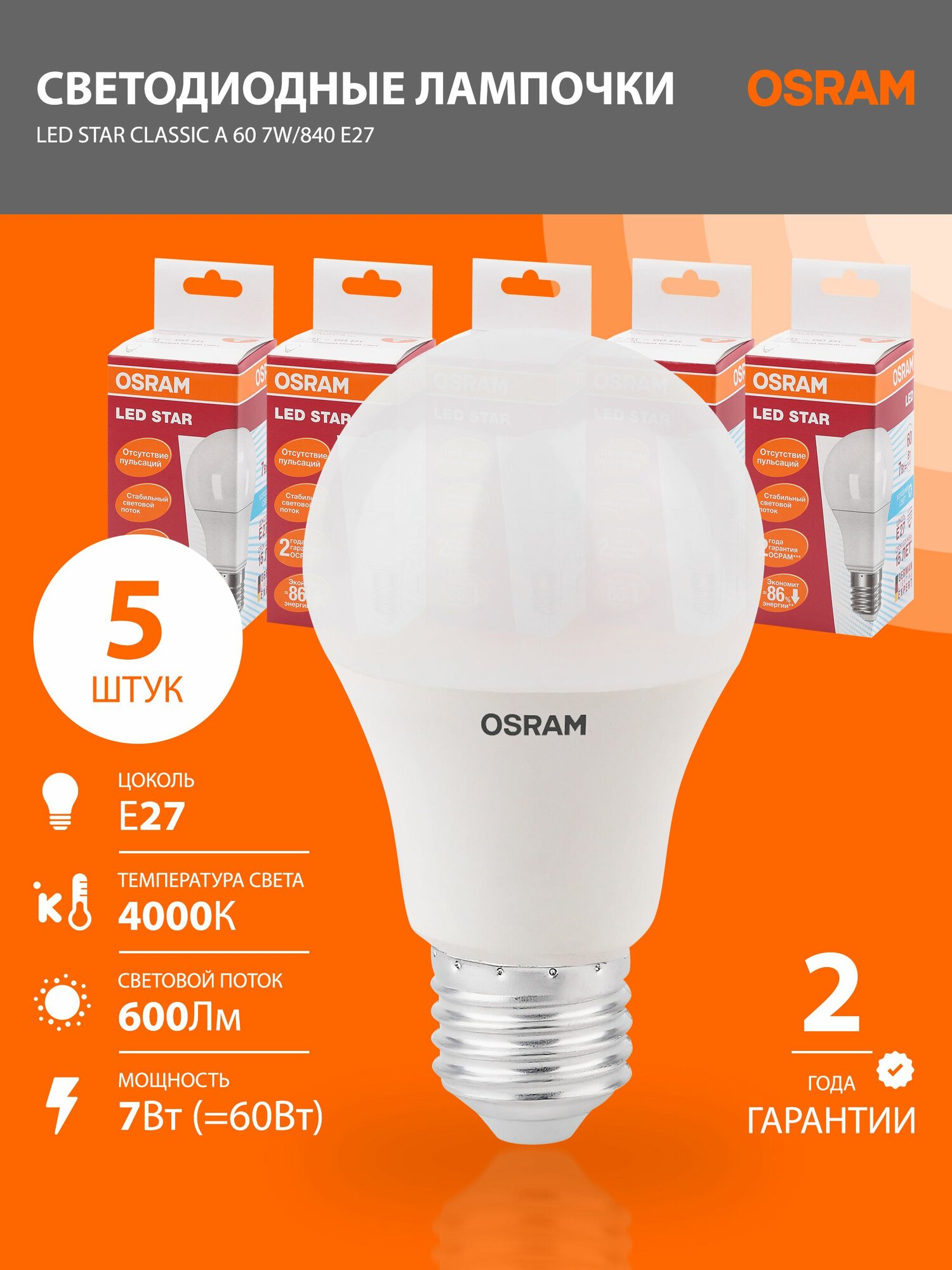 Лампочки светодиодные E27 OSRAM LED Star, 600лм, 7Вт, 4000К дневной свет, 5шт: сравнение цен, характеристики, фото, актуальное наличие и цены.