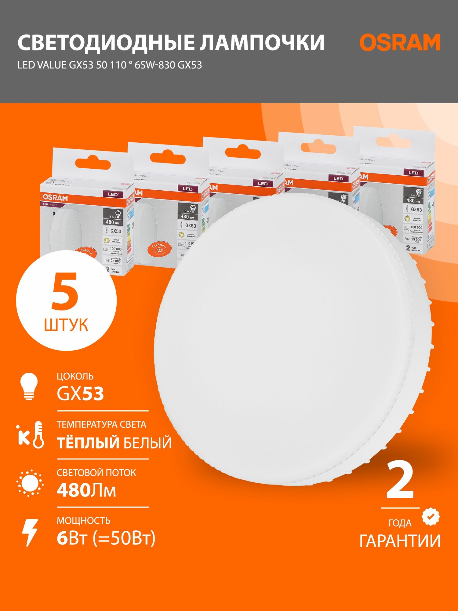 Купить Лампы светодиодные GX53 Osram LED Value GX 480лм 6Вт 3000К теплый свет, 5 шт с доставкой по всей России.
