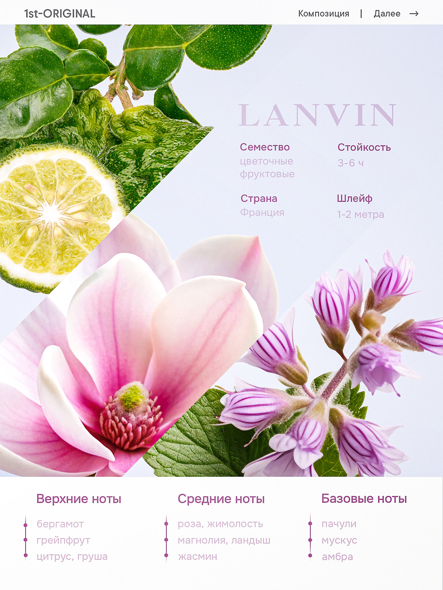 В романтичном сердце аромата органично переплелись жимолость, магнолия, ландыш, роза, жасмин, создав роскошный цветочный оттенок. Этот запах манит и волнует, соблазняет и нежно ласкает. Главную роль в нем играет королева цветов, находящаяся в центре.