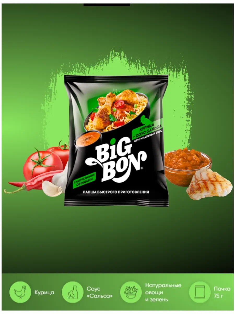 Горячий микс традиционного пряного томатного соуса, аппетитной лапши и сочной курочки. Лапша на основе куриного бульона и в сочетании с пряным соусом. Соус изготавливается на основе растительного масла и томатной пасты с овощами и специями. Добавки из сушёных овощей и специй делают лапшу более вкусной и питательной. Лапша быстрого приготовления Биг Бон - это отличный вариант сытного обеда или ужина! Понадобится всего несколько минут, чтобы приготовить аппетитную лапшу с бульоном и соусом! Настроение еще лучше вместе с BIGBON! Вкусная лапша с оригинальными соусами, нежное картофельное пюре и хрустящие чипсы - для твоих радостных моментов. Любой момент становится вкуснее! С BIGBON жизнь ярче! Необычные вкусы раскрасят твоё настроение! Ароматные, пряные или острые - выбери свой BIGBON! Да пребудет с тобой вкус! Соус решает! Таких соусов, как у нас, ты нигде не встретишь. Выбирай на свой вкус: горячая сальса, нежный томатный с базиликом, ароматный гуляш и другие оригинальные соусы ждут тебя! Максимум вкуса до последней капли!