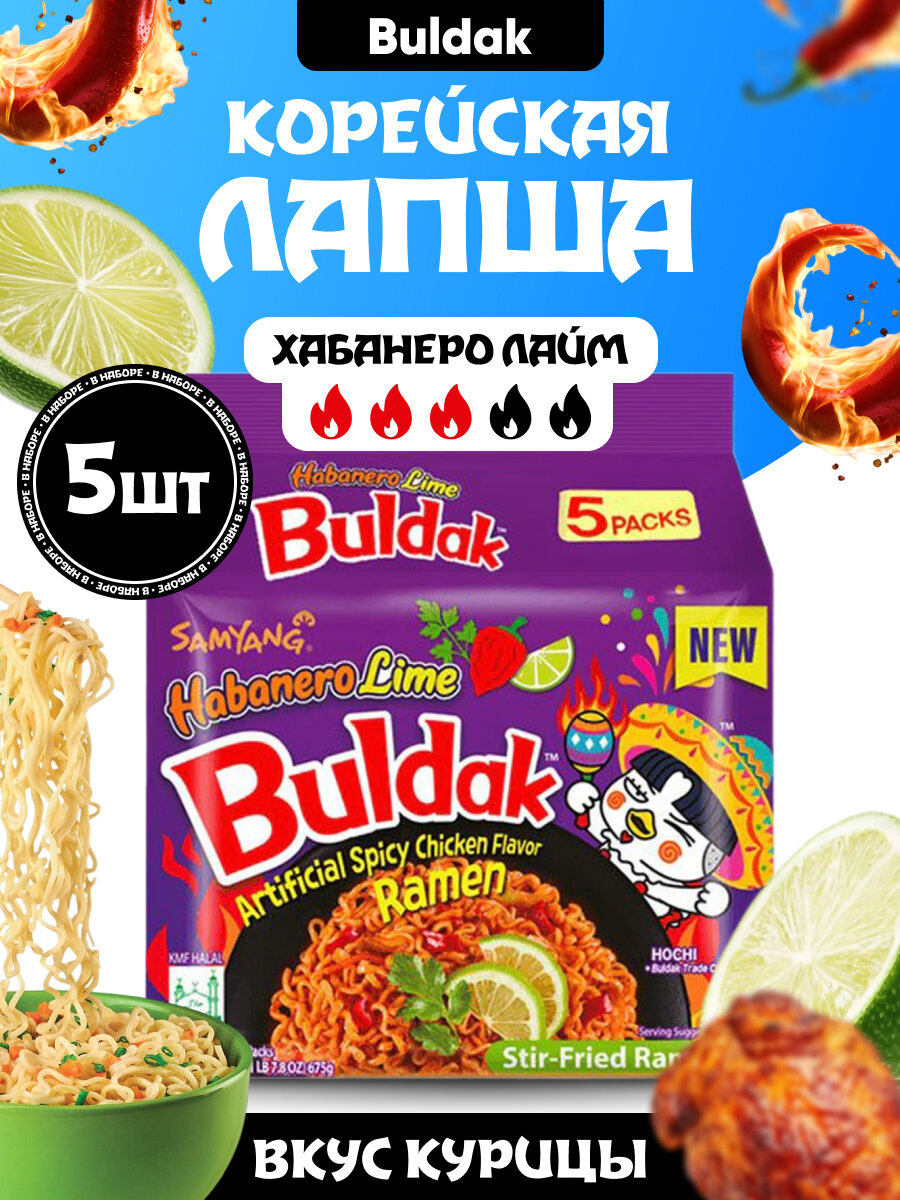 Лапша быстрого приготовления Samyang Buldak Habanero Lime со вкусом острой курицы и лайма, набор 5 шт.: сравнение цен, характеристики, фото, актуальное наличие и цены.