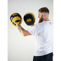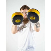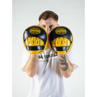 Лапы созданы специально для наставников тяжеловесов и сильно бьющих спортсменов. Для мощных ребят - мощные лапы. Ваш подопечный обладает сильнейшим ударным потенциалом? Тогда Вам обязательно нужны лапы BIG-Air в расцветке BumbleBee от Leaders! Специально для повышенной профессиональной нагрузки, мы создали лапы увеличенной толщины. Мы спроектировали уникальную компоновку конструктивных элементов воздушного кармана с пенными составами различной плотности, благодаря которой, происходит максимально эффективное гашение энергии удара, а затем увеличили и усилили её! Ваши кисти, запястья, локти и плечевой пояс теперь в безопасности! Наши специалисты, подобрали высококачественные пенные составы с технологией Ultra Light, обладающие оптимальным соотношением низкого веса и поглощающей способности, обеспечившие революционно низкий вес для кожаных лап данных габаритов! Также отличительной особенностью наших лап является внутреннее пространство для рук тренера. Мы внедрили мягкую полусферу, которая обеспечила лучшую в сегменте посадку руки, при полном сохранении всех необходимых тренеру свойств и ощущений. Кроме того, полусфера способствует дополнительной защите запястья от скручивания, при неточных ударах. Область пальцев закрыта кожаным "капюшоном" с дополнительным тонким слоем пены. Запястье фиксируется удобным ремнем на липучке. Также предусмотрены вентиляционные отверстия. Лапы выполнены из роскошной 100% натуральной кожи премиальной выделки. Мягкий живой дышащий материал дарит комфорт и безупречный внешний вид! Для максимальной долговечности, мы усилили кожу на ударной поверхности двумя технологичными составами. Лапы идеальны для силовой работы различной интенсивности на различных скоростях. Габариты тренерских лап: Высота: 25 см, Ширина: 22 см, Толщина: 11 см, Вес: 430 гр.