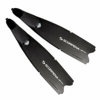 Сборные ласты F1 Apnea с пластиковой лопастью достаточно длинные и мягкие, предназначенные, прежде всего, для фридайверов и подводных охотников. Лопасти выполнены из очень гибкого и эластичного пластика, который позволяет достичь большой силы гребка и высокой скорости движения при незначительных физических усилиях пловца. Этому также способствует переменная толщина лопасти по длине и две направляющие в средней части, которые позволяют удерживать ласту в одной плоскости при гребке, облегчая плавание. Лопасти доступны в двух вариантах жёсткости. Они разделены по цвету: чёрные, красные и неоново-зелёные имеют стандартную мягкость. Лопасти голубого, мятного и белого цветов - очень мягкие. Степень мягкости влияет на снижение нагрузки и усталости мышц ног и, следовательно, увеличение времени плавания или ныряния. Это особенно важно для начинающих фридайверов и подводных охотников. Лопасти крепятся на калошу Scorpena F1, состоящую из различных по жёсткости типов резины: мягкий на стопе и комфортно фиксирующий в зоне голеностопа. Для удобства одевания на носке есть отверстие для стекания воды, а на заднике - язычок для подтягивания ласты на пятку. Резиновые «усы», держащие лопасть с боков, защищают ее от повреждений и продлевают срок службы ласт. Колодка калоши достаточно узкая, подходит людям с узкой стопой и невысоким подъемом. Общая длина лопасти 77 см, длина рабочей части от комля до кончика - 62 см, ширина лопасти 21,5 см.