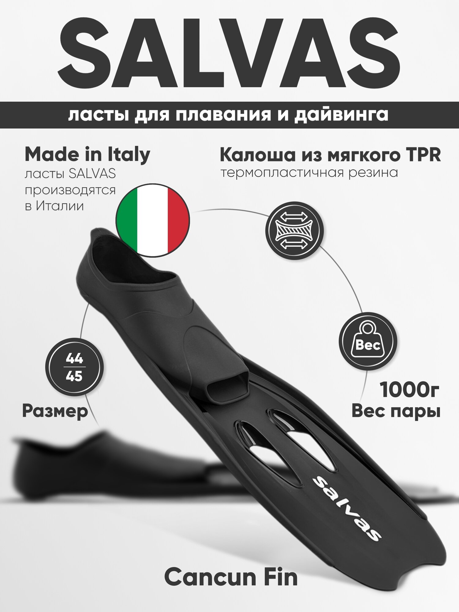 Ласты SALVAS производятся в Италии с использованием только качественного сырья итальянских производителей. Индивидуальная упаковка, полиэтиленовый пакет с логотипом и пластиковыми ручками. Упакованы в короба по 12 пар.