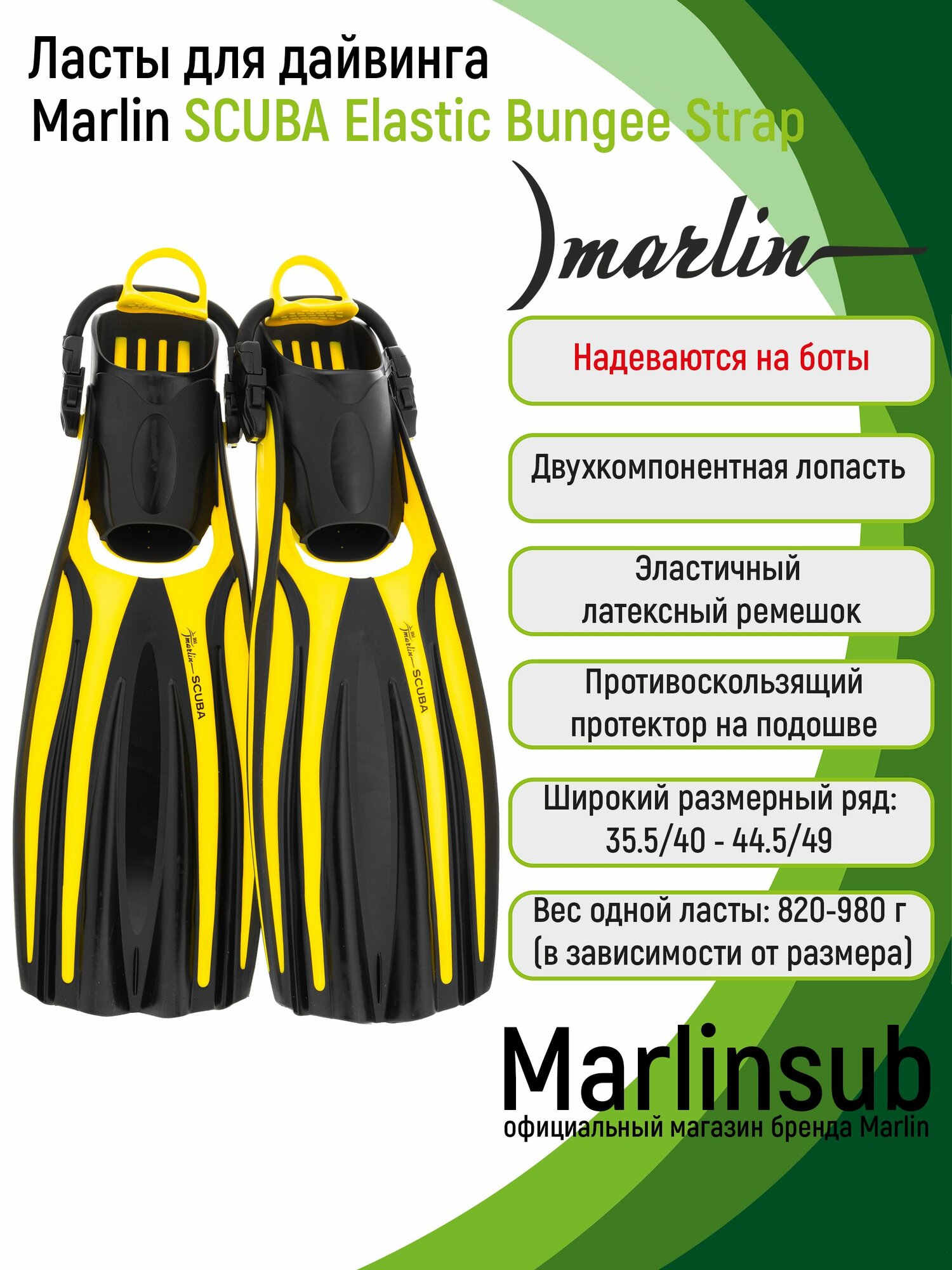 Калоша ласт Marlin Scuba разработана с учетом одевания на неопреновый ботинок. Новый, эластичный латексный ремешок Elastic Bungee Strap с резиновым задником обеспечивают надежную фиксацию ласт на ноге. Ремешок Elastic Bungee Strap не теряет своей эластичности при эксплуатации в холодной воде, не подвержен воздействию солнца, соли и химических веществ. Большая петля на заднике ремешка упрощает процесс одевания и снятия ласт даже в толстых неопреновых перчатках.