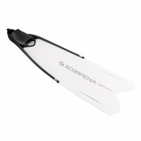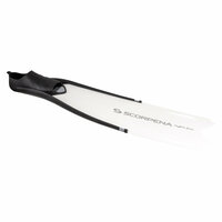 Сборные ласты F1 Apnea с пластиковой лопастью достаточно длинные и мягкие, предназначенные, прежде всего, для фридайверов и подводных охотников. Лопасти выполнены из очень гибкого и эластичного пластика, который позволяет достичь большой силы гребка и высокой скорости движения при незначительных физических усилиях пловца. Этому также способствует переменная толщина лопасти по длине и две направляющие в средней части, которые позволяют удерживать ласту в одной плоскости при гребке, облегчая плавание. Лопасти доступны в двух вариантах жёсткости. Они разделены по цвету: чёрные, красные и неоново-зелёные имеют стандартную мягкость. Лопасти голубого, мятного и белого цветов - очень мягкие. Степень мягкости влияет на снижение нагрузки и усталости мышц ног и, следовательно, увеличение времени плавания или ныряния. Это особенно важно для начинающих фридайверов и подводных охотников. Лопасти крепятся на калошу Scorpena F1, состоящую из различных по жёсткости типов резины: мягкий на стопе и комфортно фиксирующий в зоне голеностопа. Для удобства одевания на носке есть отверстие для стекания воды, а на заднике - язычок для подтягивания ласты на пятку. Резиновые «усы», держащие лопасть с боков, защищают ее от повреждений и продлевают срок службы ласт. Колодка калоши достаточно узкая, подходит людям с узкой стопой и невысоким подъемом. Общая длина лопасти 77 см, длина рабочей части от комля до кончика - 62 см, ширина лопасти 21,5 см.