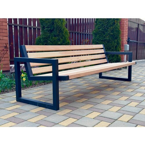 Лавочка садовая. Каркас выполнен из трубы 50/50/2 мм. Окрашена порошковой краской. Сиденья лиственница. Покрыто маслом воском. Размеры: Длина 221 см. Глубина 75 см. Высота 70 см. Вес 45 кг