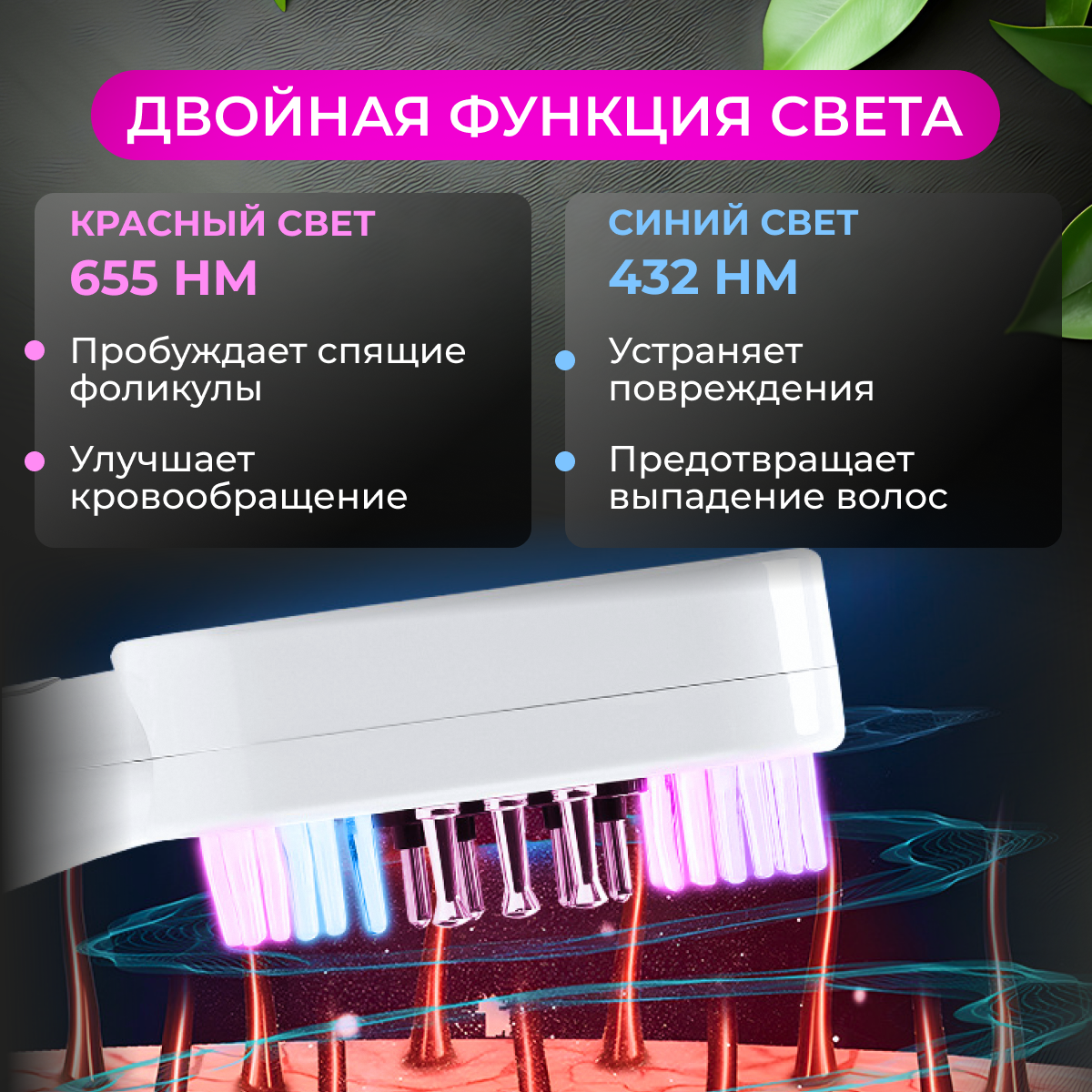 Массажер для роста волос, встроенный в расческу, обеспечивает микротоковый массаж, который стимулирует кровообращение и способствует росту волос. Это позволяет улучшить состояние волос, сделать их более здоровыми и крепкими.