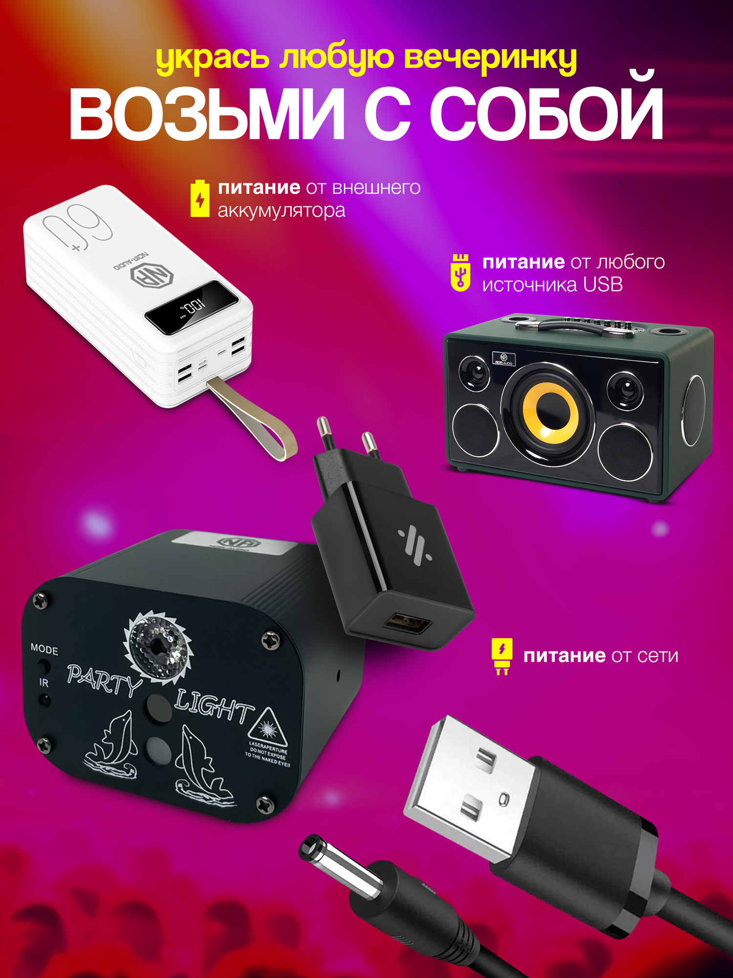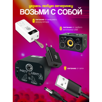 Простая установка. Легко устанавливается и прост в использовании, при желании вы можете поставить диско лазер на стол или установить на стену или потолок. Угол покрытия - 160 градусов. Лазерный светильник работает от обычной розетки на 220 Вольт (необходим USB-адаптер питания) или от устройств, которые поддерживают питание от USB (в комплекте 2 метровый USB-кабель). Ультра-маленький размер позволяет легко носить с собой куда угодно.