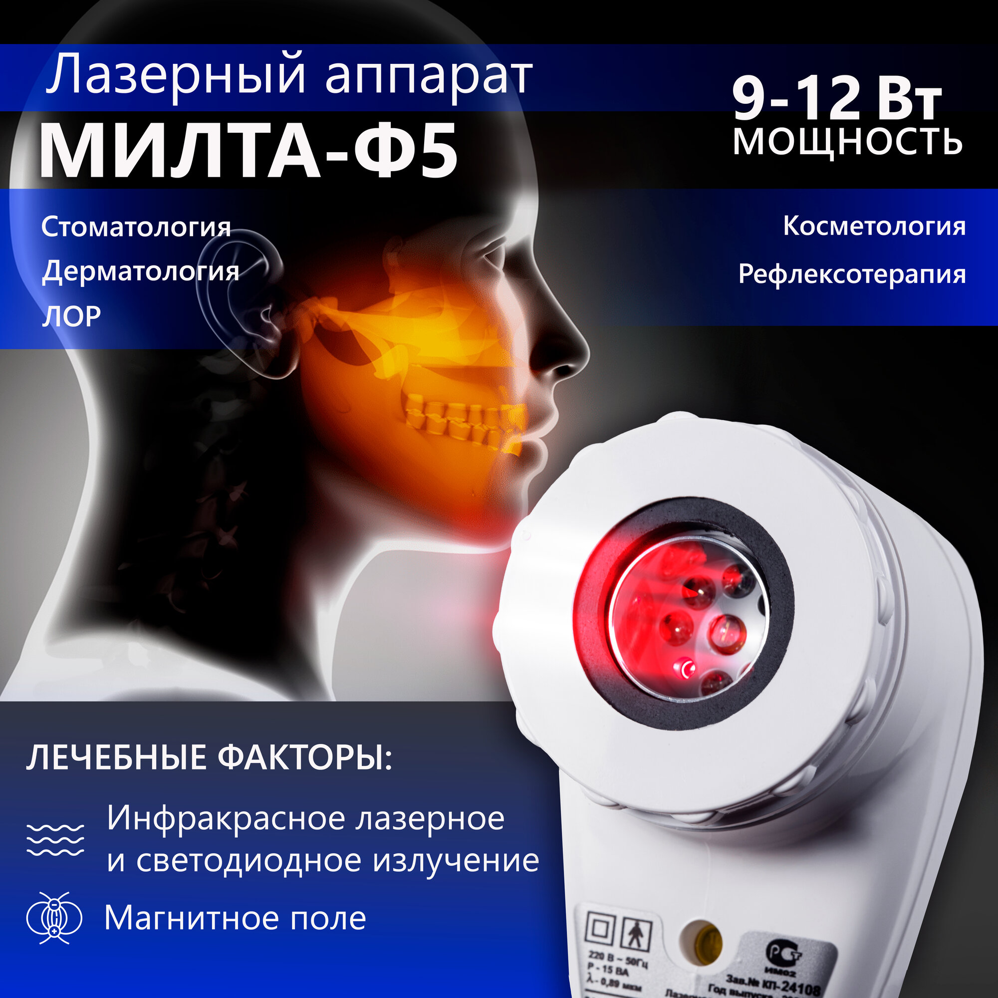 МИЛТА-Ф-5 (9-12 Вт) - магнито-лазерный терапевтический аппарат для лечения заболеваний дома и лечебных учреждениях. Лечебные факторы: 1. Инфракрасный лазер. 2. Красные и инфракрасные светодиоды. 3. Магнит. Аппарат данной мощности (9-12 Вт) подходит для лечения взрослых людей и глубоких заболеваний. Милта-Ф-5 работает от сети 220 V. физиотерапевтические факторы аппарата Инфракрасное лазерное излучение. Светодиодное инфракрасное излучение. Светодиодное красное излучение. Магнитное поле. какие болезни лечит аппарат? Гипертония, вегетососудистая дистония. Заболевания суставов. Раны, ожоги, переломы костей, травмы, геморрой. Болезни вен, артерий, трофические язвы, пяточные шпоры. Остеохондроз, радикулиты, невриты, неврозы. Простатит, цистит, мочекаменная болезнь. Бронхиты, бронхиальная астма, плевриты. Риниты, синуситы, тонзиллиты. показания К применению аппарата: хирургические болезни заболевания ВЕН нижних конечностей травматические повреждения длинных трубчатых костей, сухожилий заболевания костей И суставов заболевания нервной системы, психоневрология заболевания артерий НОГ заболевания органов желудочно-кишечного тракта сердечно-сосудистые заболевания воспалительные заболевания бронхов И лёгких гинекологические заболевания урология эндокринные нарушения заболевания кожи болезни УХА, горла, носа (лор-заболеваия) стоматология спортивная ПРАКТИКА