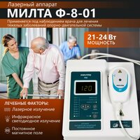 Аппарат лазерной терапии «МИЛТА-Ф-8-01» мощностью 21-24 Вт предназначен для оснащения лечебных учреждений различного профиля. Он оказывает лечебное воздействие на организм пациента, основанное на одновременном или раздельном воздействии тремя физическими факторами: постоянным магнитным полем, импульсным лазерным и постоянным светодиодным излучениями инфракрасного (ИК) диапазона длин волн оптического спектра.