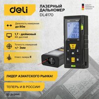 Купить Лазерный дальномер Deli DL4170 (Диапазон измерения 0,05-80м, точность 3мм, дисплей 1,7 дюймов, авто. отключение) с доставкой по всей России.