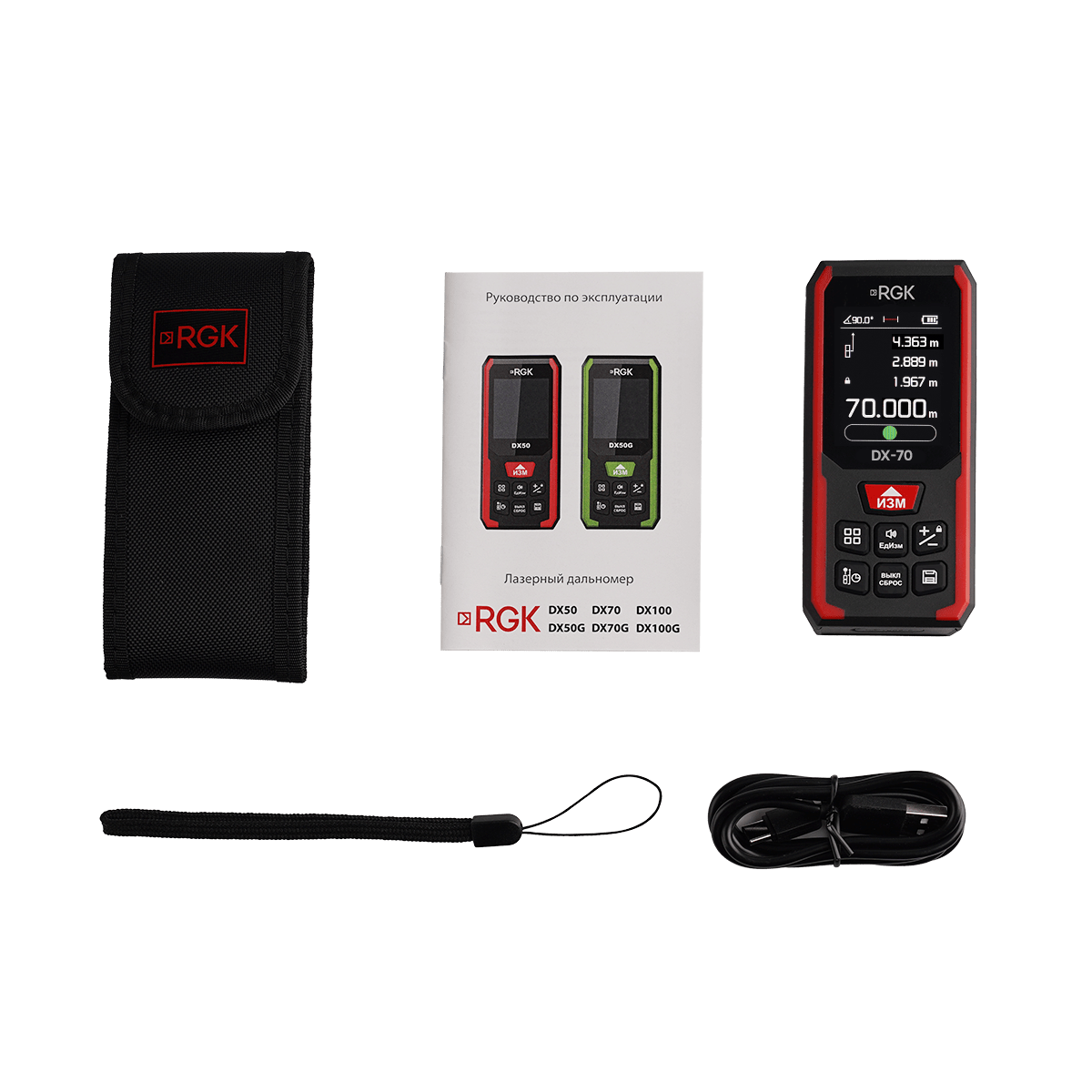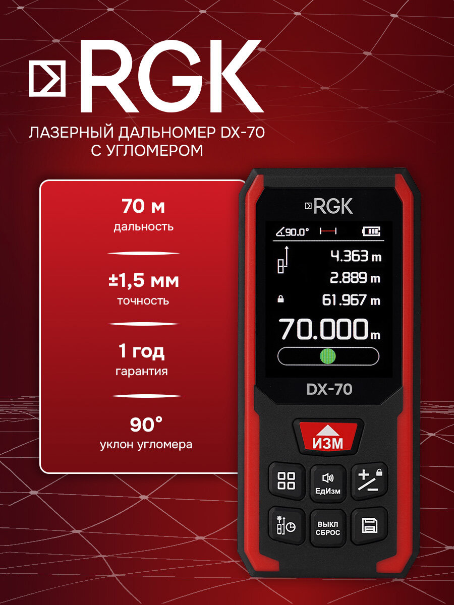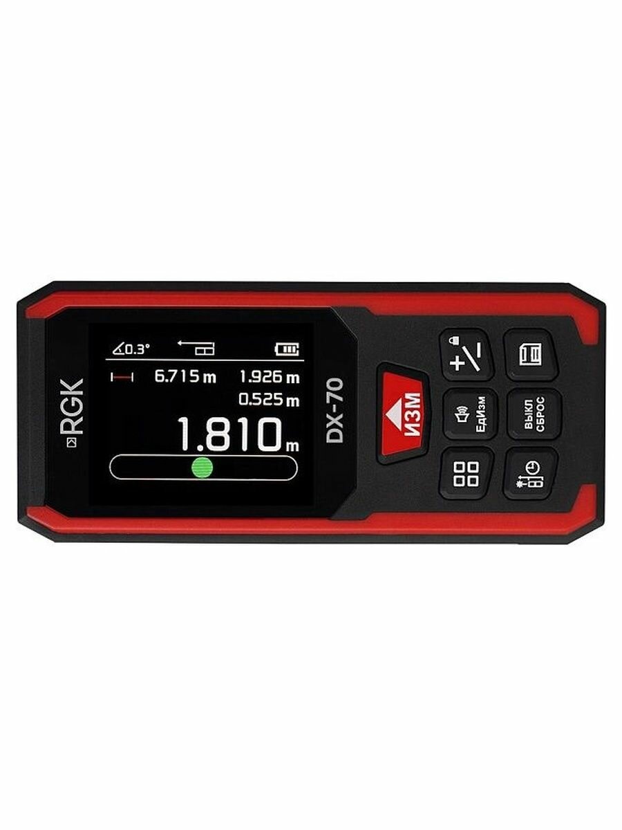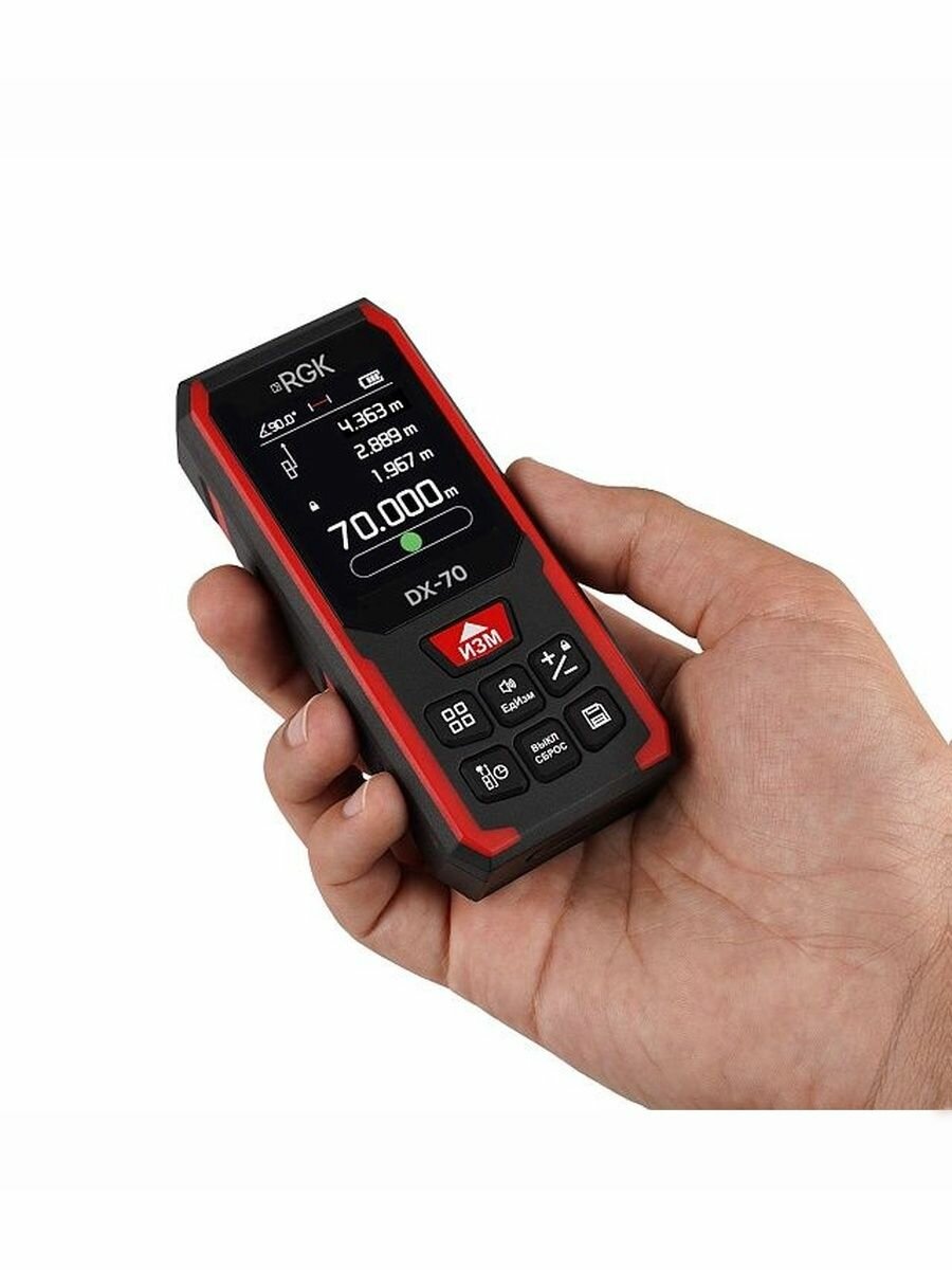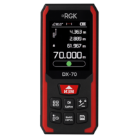 Лазерный дальномер RGK DX70 представляет собой высокопроизводительный прибор строительного назначения в прочном двухслойном корпусе, предназначенный для определения размеров и дистанций до целевых объектов на расстоянии до 70 м, а также способный выполнять измерения уклонов благодаря встроенному инклинометру. От лазерных рулеток других, более дешевый серий данного бренда, с таким же измерительным диапазоном, прибор отличается улучшенной точностью, обеспечивая погрешность линейных измерений не более ±1,5 мм, поддержкой расширенного перечня режимов и высокой наглядностью, что обеспечивает цветной графический дисплей.