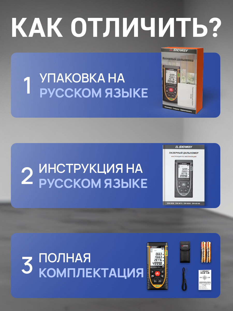 Дальномер SNDWAY SW-TG50 - это надежный и точный инструмент для измерения расстояний. Он оснащен лазерным типом дальномера, который обеспечивает высокую точность измерения до 2 метров. Дальность измерения без отражателя составляет 50 метров, что позволяет использовать его в различных условиях. Ударопрочный корпус дальномера обеспечивает защиту от ударов и падений, что делает его долговечным и надежным инструментом. Встроенная память позволяет сохранять до 30 замеров, что удобно для работы с большими объемами данных. Дальномер оснащен функцией Пифагора, которая позволяет быстро и точно вычислять площадь и объем различных объектов. Функция сложения/вычитания позволяет суммировать или вычитать значения, что упрощает процесс работы с большими объемами данных. Автоматическое отключение дальномера через 150 секунд после последнего использования обеспечивает экономию заряда батареек. Подсветка дисплея позволяет работать с инструментом в условиях недостаточного освещения. Устройство работает от двух батареек типа 1.5В AAA, что обеспечивает его автономность и удобство использования. В комплект поставки дальномера входят чехол, ремешок, отражательная пластина и инструкция.