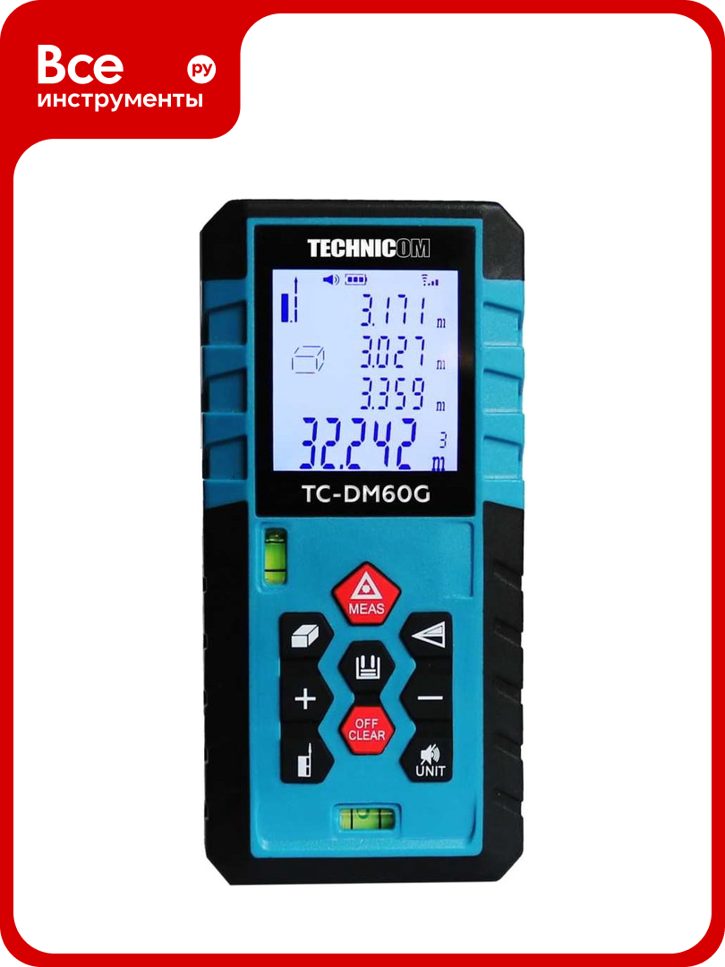 Лазерный дальномер-угломер TECHNICOM дальность 60м, два источника питания, цифровой угломер, 2 источника питания, 2 пузырьковых уровня, 3 точки отсчёта TC-DM60G: сравнение цен, характеристики, фото, актуальное наличие и цены.