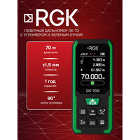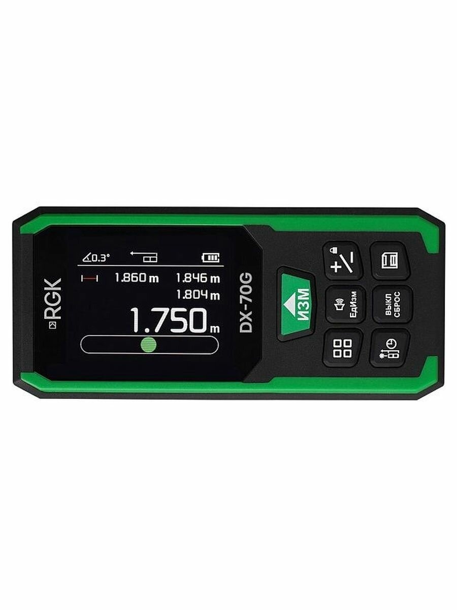 Строительный лазерный дальномер RGK DX-70G, помимо стандартных для своего класса инструментов режимов, обеспечивающих определение площадей, объемов, выполнение косвенных измерений и простых вычислений, дополнительно реализует функцию разметки и электронного пузырькового уровня. Показания автоматически сохраняются во внутренней памяти на 100 ячеек, которая циклически перезаписывается после полного заполнения.