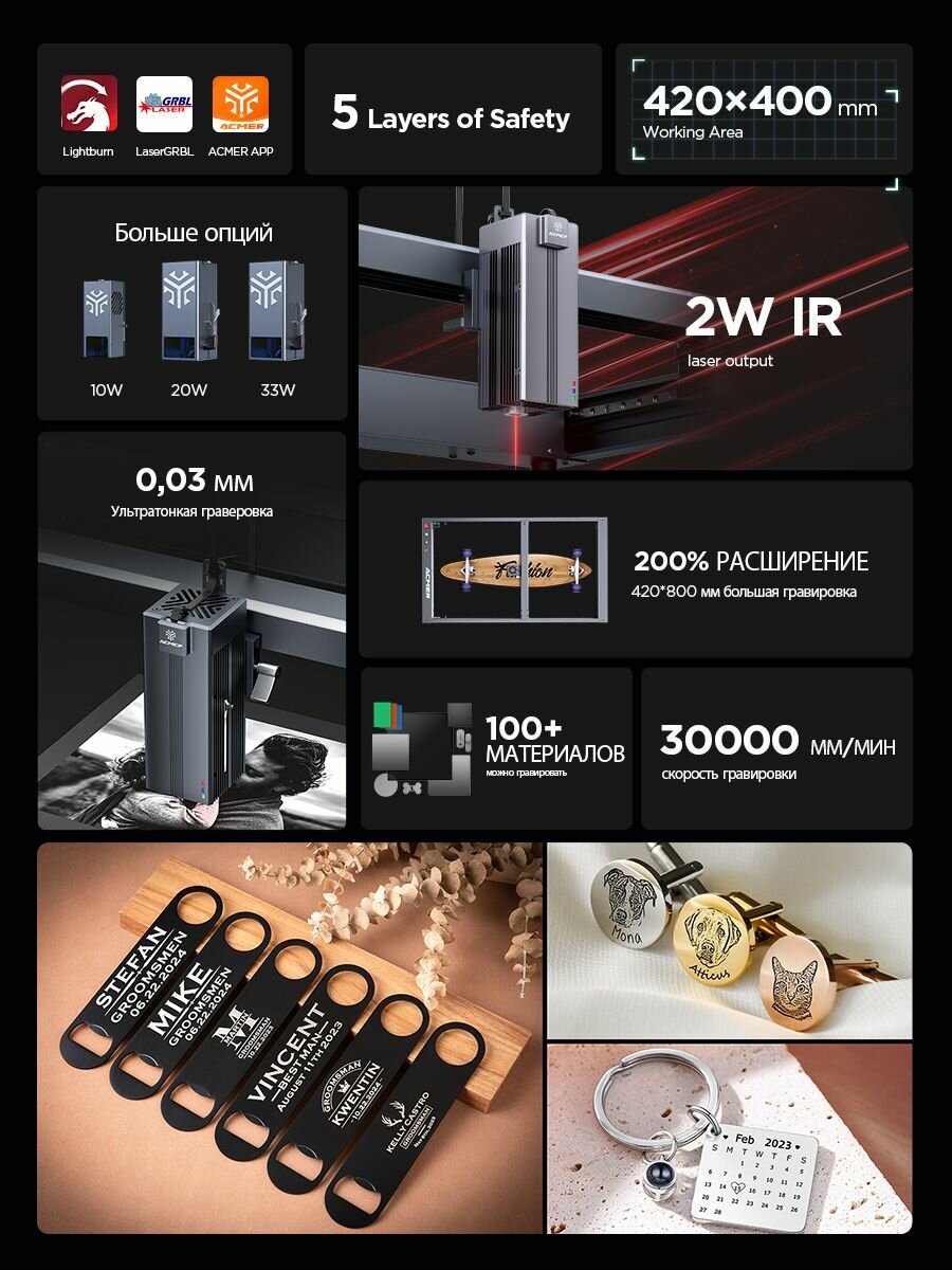 - Программное обеспечение для управления:LightBurn/LaserGRBL/ACMER App (Android) / MKS (iOS)