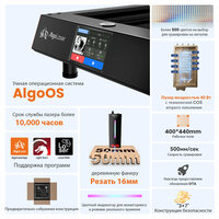 Лазерный модуль с мощностью до 40 Вт позволяет выполнять точную гравировку и резку на разнообразных материалах, включая дерево, акрил, кожу, ткань, анодированный металл и многое другое.