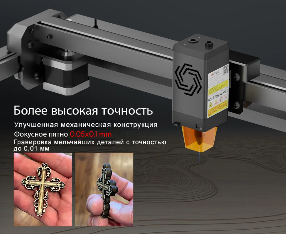 Комплектующие машины Передний модуль: 1 шт. Задний модуль: 1 шт. X-осевой модуль: 1 шт. Направляющая Y (левая): 1 шт. Направляющая Y (правая): 1 шт. Лазерный модуль: 1 шт. Кабели и аксессуары Главный жгут проводов: 1 шт. Лазерный кабель: 1 шт. Wi-Fi-антенна: 1 шт. Ремни ГРМ: 2 шт. Комплект холостых роликов: 2 шт. USB-кабель: 1 шт. Стяжки: 10 шт. Алюминиевая пластина (чёрная): 1 шт. Жгут YRR (количество не указано) Защитный кожух лазера (количество не указано) Инструменты Шестигранные ключи: 2 мм, 3 мм, 2,5 мм — по 1 шт. Винты с внутренним шестигранником: M4×8: 2 шт. M3×6: 2 шт. Стопорные винты M4: 2 шт. Наружный шестигранный ключ: 1 шт. Дополнительные компоненты Тестовые деревянные пластины: 4 шт. Защитные очки: 1 шт. Маленькая щётка: 1 шт. Блок питания: 1 шт. Кабель питания: 1 шт. Комплект для лазера: 1 набор TF-карта 8 ГБ: 1 шт. Кард-ридер: 1 шт. Ключ для станка: 1 шт. Тестовый акрил: 1 шт. Документы Сертификаты: 3 листа