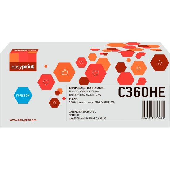 Картридж лазерный Easyprint LR-SPC360H C для Ricoh SP C360DNw/C360SNw/C360SFNw/C361SFNw (5000 стр.) голубой, с чипом: сравнение цен, характеристики, фото, актуальное наличие и цены.