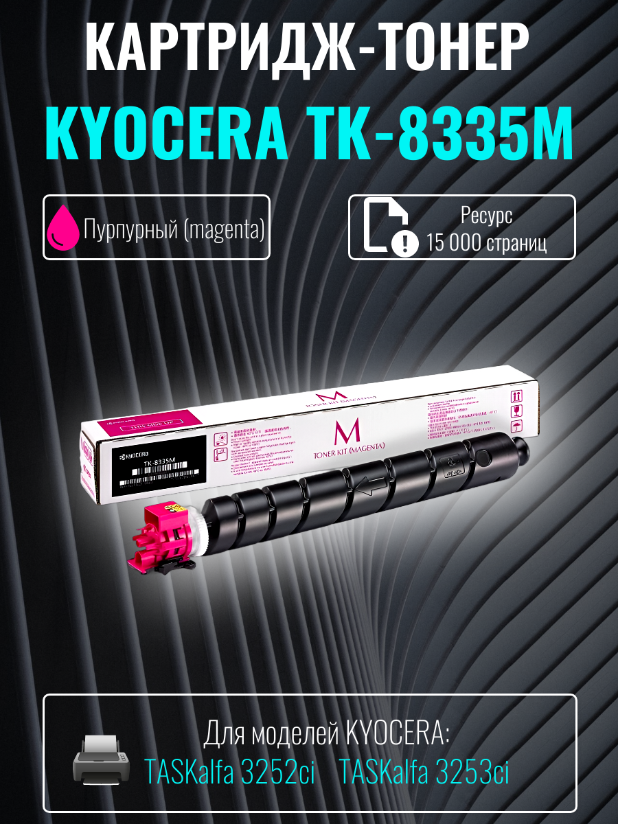 Фирменный лазерный картридж Kyocera TK-8335M - это гарантия качества и бесперебойной работы оборудования. Высокое качество печати, лучшая совместимость с печатающим устройством. Помогает подготавливать качественные печатные материалы, востребован в офисах и на производстве для создания флаеров, фото, интерьерного декора, сопроводительных графических элементов инженерной, дизайнерской и иной документации. Картридж предназначен для печати на лазерных принтерах. Ресурс 15 000 страниц. Цвет тонера - Пурпурный (magenta). Совместимые модели принтеров/МФУ: KYOCERA TASKalfa 3252ci.