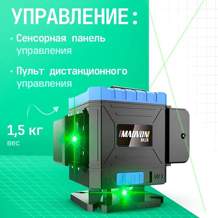12 зеленых лучей MAOVON M81216 оснащен 12 зелеными лучами, что позволяет получить четкое и яркое изображение на больших расстояниях. Дальность построения без приемника составляет 30 метров, а с приемником - до 30 метров.