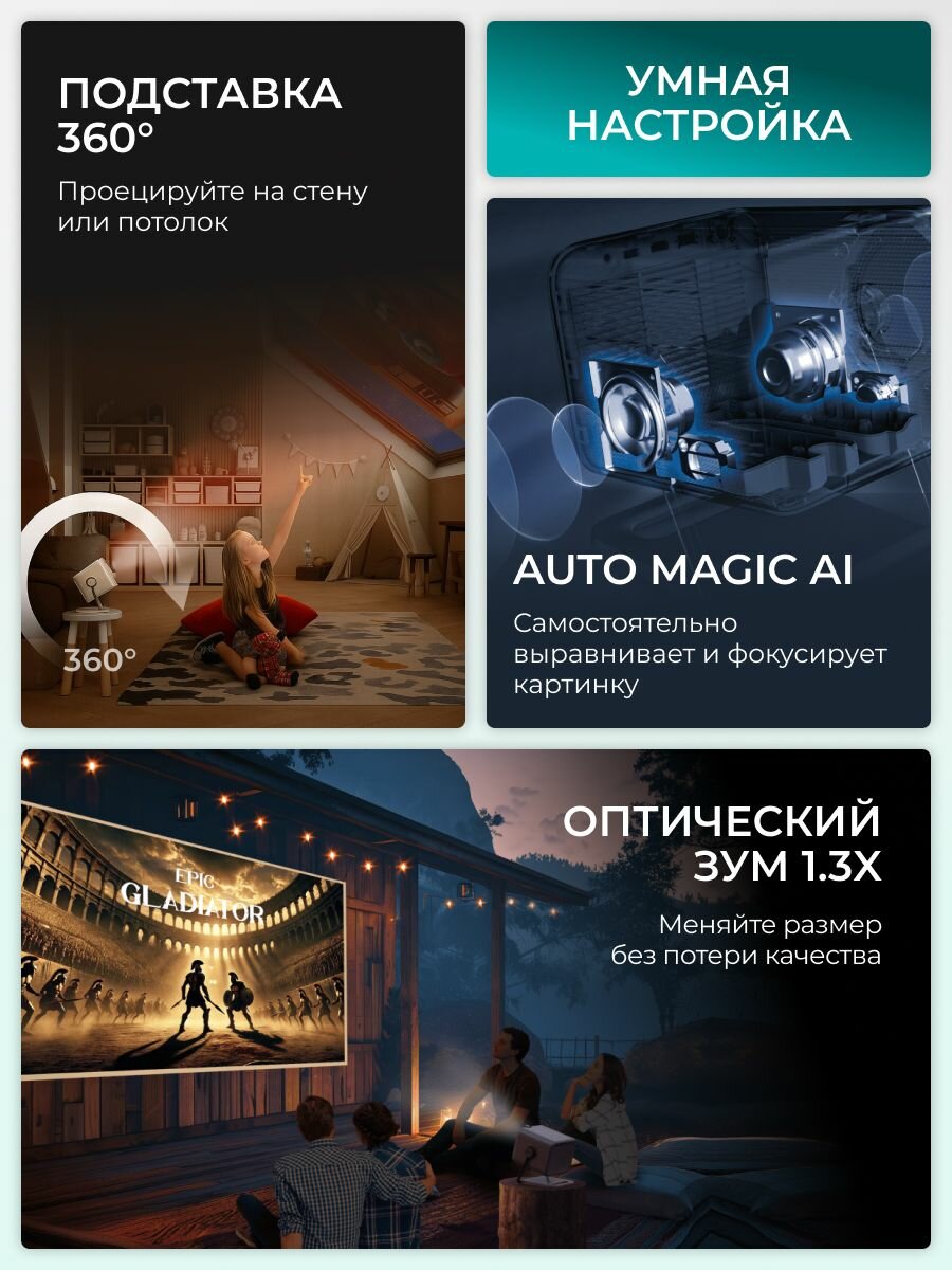 Продуманная система DLP управляет работой 2,07 миллиона микрозеркал, чтобы создавать четкое 4K-изображение с диагональю до 150 дюймов, а технология AI 4K Clarity отвечает за отображение мельчайших деталей и кристальную чистоту каждого пикселя. Невероятно живые цвета радуют взор. Четкий трехцветный лазерный источник света обеспечивает несравненную глубину изображения с естественной передачей малейших нюансов. Увеличивайте и уменьшайте масштаб изображения без ущерба для четкости и чистоты картинки. С гибко настраиваемым зумом (коэффициент – 1,3) изображение в формате 4K не теряет в качестве даже на близком расстоянии. Благодаря технологии Dolby Vision проектор обеспечивает высокий уровень детализации теней и яркости светлых фрагментов, будь то новейший контент или старые добрые игры.