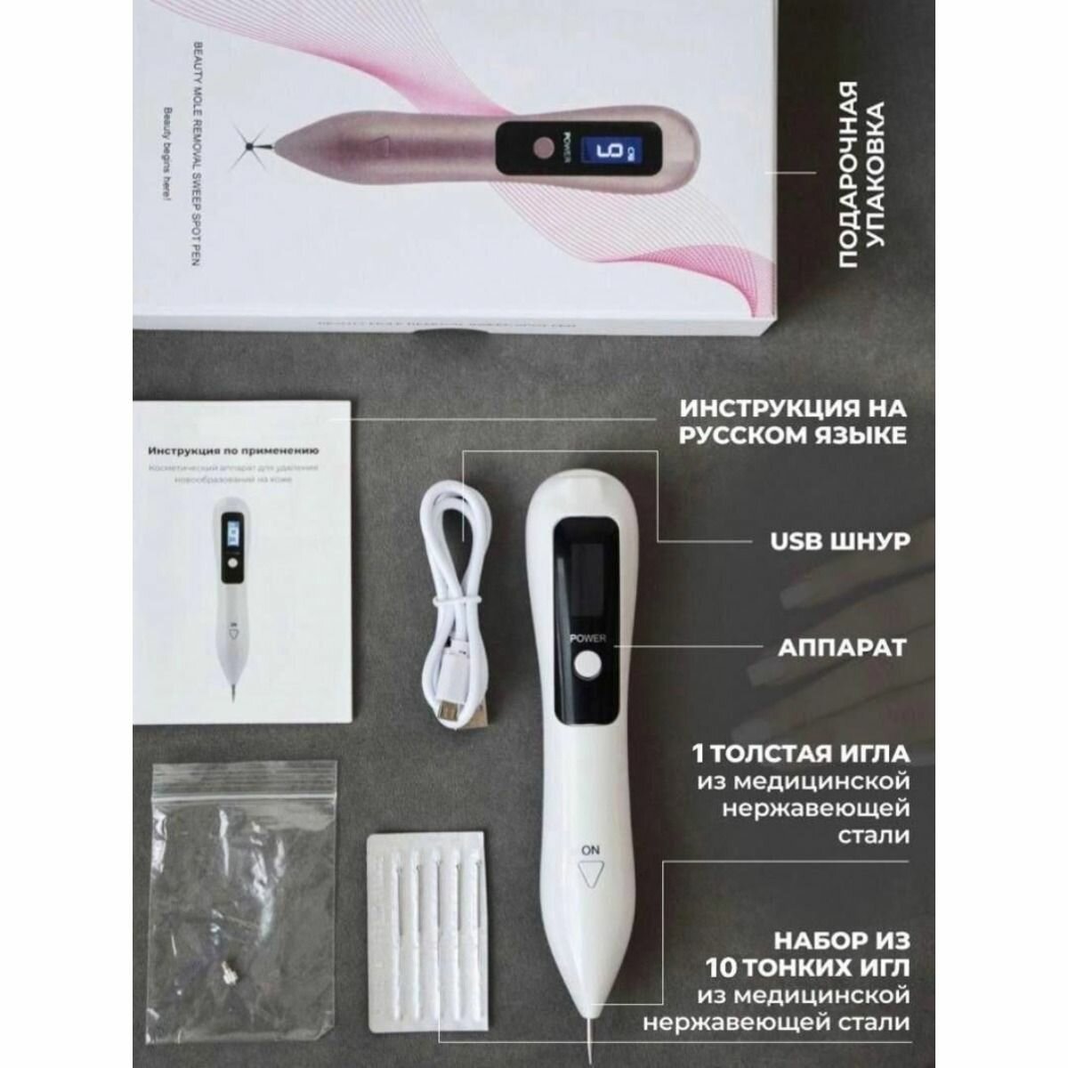 Косметическое оборудование, USB-кабель, одна толстая игла и десять тонких игл, инструкция