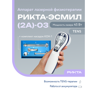 Аппарат РИКТА–ЭСМИЛ (2А)-03 в комплектации: – аппарат РИКТА–ЭСМИЛ (2А)-03 — 1 шт. – зарядное устройство — 1 шт. – руководство по эксплуатации — 1 шт. – методическое пособие — 1 шт. – сумка для хранения аппарата — 1 шт. Комплект оптических насадок КОН-1 (4) — 1 шт.