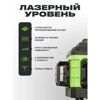 Профессиональный лазерный нивелир 4D — это точный инструмент для строительных, ремонтных и отделочных работ. Устройство проецирует 16 ярко-зелёных линий на 4 плоскости с охватом 360°, обеспечивая полную разметку стен, потолков и пола. Благодаря самовыравниванию с углом до 5° и встроенной функции звукового сигнала при наклоне более 3°, нивелир помогает избежать ошибок при работе.