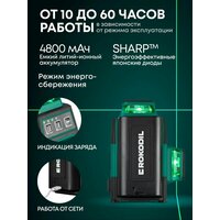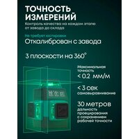 Лазерный уровень Rokodil Ray Air – универсальный самовыравнивающийся прибор с 3 лазерными излучателями, который отличается повышенной надежностью и точностью. Всего нивелир проецирует 12 линий по вертикали и горизонтали, строит перекрестия и точку отвеса, что делает его отличным вариантом для всех типов работ. Погрешность сведена до минимума и составит не более 0.2 мм/м. В конструкции применяются японские излучатели SHARP, за счет чего линии строятся тонкими, четкими и яркими в разных условиях работы. Зеленый луч будет отлично заметен даже при свете солнца. Предусмотрены 3 степени регулировки яркости. Дальность проецирования с сохранением рабочей точности достигает 30 м, использование приемника увеличит этот показатель до 70 м. Благодаря этому строительный инструмент подходит для выполнения разметки в просторных помещениях и на больших участках. Широкий функционал расширяет возможности лазерного уровня и делают работу максимально эффективной. В модели есть: автоматическое выравнивание, блокировка маятника, дистанционное управление. Емкости аккумулятора 4800 мАч хватает на автономность до 60 часов на одном заряде. Возможна работа от сети, поэтому можно не прерывать задачу даже в случае разрядки батареи. Прочный корпус имеет резиновое покрытие и отдельную защиту для каждой башни, что минимизирует вероятность повреждений и раскалибровки от ударов и падений. 3d лазерный уровень компактный и легкий – всего 382 г, благодаря этому он легко размещается в труднодоступных местах и на различной высоте. Прорезиненные ножки препятствуют скольжению и повышают устойчивость. На лазерный нивелир действует гарантия производителя 5 лет.