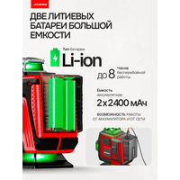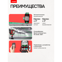 Уровень оснащен 8 горизонтальными и 8 вертикальными лучами, что позволяет быстро и точно строить плоскости и уровни. Зеленый цвет луча обеспечивает отличную видимость даже при ярком солнечном свете, что делает работу более комфортной и безопасной.
