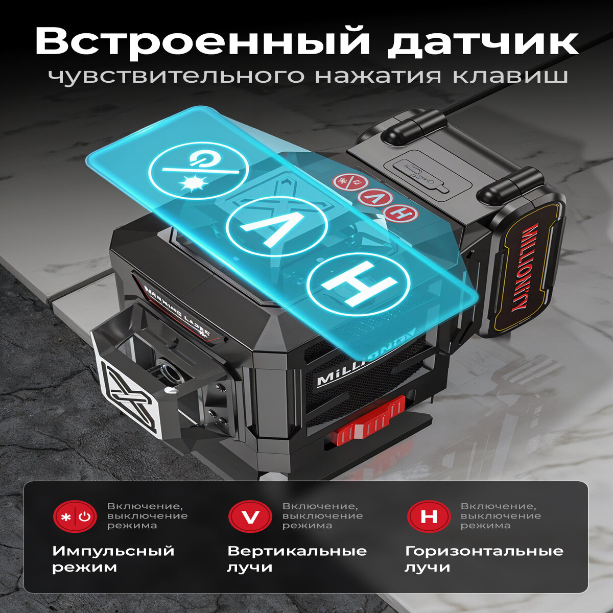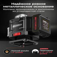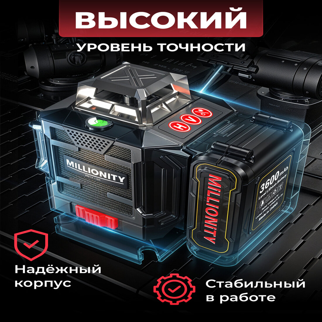 Лазерный уровень Millionity — самовыравнивающейся электронный прибор, который предназначен для внутренней отделки помещений, установки оборудования, выравнивания стен и пола, установки потолочных конструкций, перегородок и монтажа настенного оборудования, нивелировки настенных полок и другое. Работает под углом 360 градусов. Если вы хотите получить наилучший результат при строительстве или ремонте, то нивелир является одним из обязательных инструментов, которым нужно владеть. Он имеет 16 зелёных линий. С помощью них можно создавать в пространстве визуальные плоскости до 30 метров, что позволяет использовать его как для мелких работ, так и для больших проектов. Лазерный уровень имеет несколько режимов работы. При включении лазерного уровня загорается цифровой дисплей с индикатором заряда. Нажимая кнопки Н и V вы можете выбрать соответствующие лазерные линии. Мощный луч, который проецирует линии на потолочную и стеновые поверхности. Также он оснащён зелёным лазером, что делает его более точным и видимым в условиях яркого освещения. Имеет регулируемую подставку (основание), которая позволяет установить его настойке, трипод или на штативе. В комплект входят пульт управления, кейс для хранения, зарядное устройство для батарей. Два аккумулятора, подставка (платформа), трипод и настенный держатель. Резьба для установки на штатив или трипод имеет разъём 1/4˝дюйма. В комплекте имеется переходник с 1/4˝дюйма на 5/8˝дюйма. Прибор пригоден как для эксплуатации в закрытых помещениях, так и на открытых строительных площадках. Это позволяет использовать изделие при любых условиях и обеспечивает длительное время работы. Лазерный уровень 4D также имеет возможность проецировать линии в 3D модели, что поможет вам точно определить расположение стен, потолков, окон и других элементов. Данный инструмент для мужчин поможет достичь наилучшего результата при любых строительных работах.