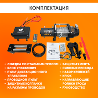 лебедка электрическая 1шт, блок управления, пульт дистанционного управления, силовые провода для монтажа, провод управления, стальные крюки, метизы, стропа