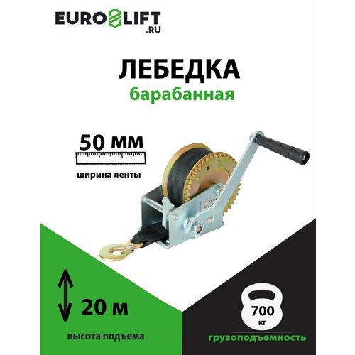 Лебедка ручная барабанная с лентой. Универсальное устройство для перемещения грузов весом до 0,7 т. Длина ленты троса увеличенная, 20 м. Изделие удобно в использовании на строительных площадках и для решения бытовых вопросов. Лебедка механическая, не требует дополнительного питания или других вспомогательных приборов. Обеспечит безопасное передвижение груза как по горизонтальной , так и вертикальной поверхности. Во избежание поломки механизма запрещено обматывать держатель лентой и зацеплять крюк за эту ленту. Лебедка автомобильная ручная: практично брать с собой в поездку за город. Компактная, удобная в хранении в гараже или багажнике, выручит в трудную минуту на дороге. Лебедка EURO-LIFT - незаменимые аксессуары для грузовых и легковых автомобилей.