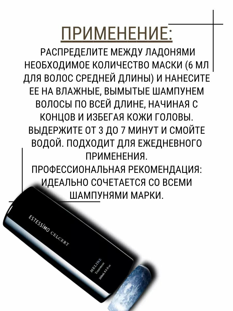 Селективная формула ESTESSiMO CELCERT оказывает направленное комплексное действие на стволовые клетки кожи головы, редактирует структуру и продлевает молодость волос. Тающий уход с кремовой основной наполняет структуру волос увлажняющими и 3D-формирующими компонентами, превращая их в шелковистое блестящее полотно, податливое укладке и выпрямлению. Способ применения: распределите лебел между ладонями необходимое количество маски (6 мл для волос средней длины) и нанесите ее на влажные, вымытые шампунем волосы по всей длине, начиная с концов и избегая кожи головы. Выдержите от 3 до 7 минут и смойте водой. Подходит для ежедневного применения. Профессиональная рекомендация: идеально сочетается со всеми шампунями марки.