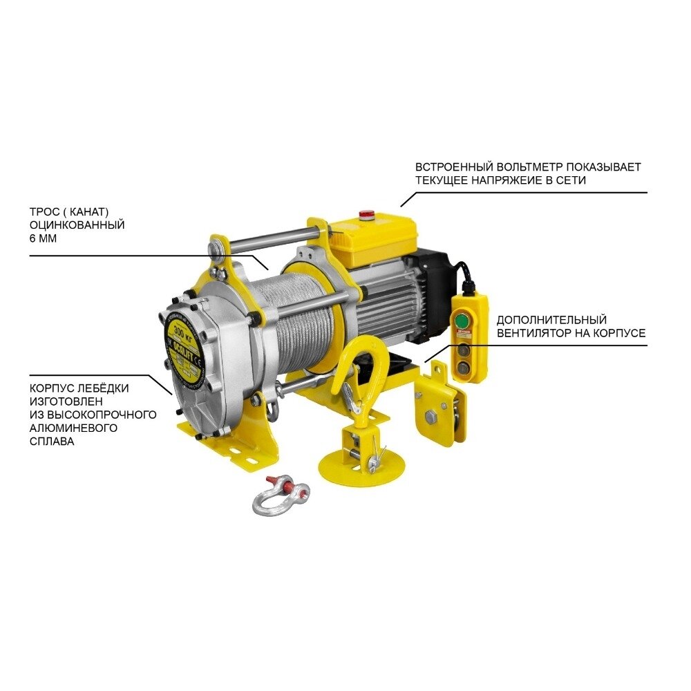 Модель лебёдки TSA 200 скоростная Грузоподъемность с блоком, кг 400 Скорость подъема, м/мин 24 Длина кабеля управления, м 3 Условия эксплуатации -20 + 40С, Лёгкий, S3-30%, У2 (Использовать под навесом) Вес, кг 43,6 Двигатель подъема, кВт 2,3 Тормоз Электромагнитный, надёжно блокирует груз при отключении питания Охлаждение Вентилятор на валу двигателя, дополнительный вентилятор на корпусе Крепление На площадке с помощью анкерных болтов на пол, на стену или на потолок Гарантия 12 месяцев Грузоподъемность, кг 200 Длина троса (м) 60 Диаметр троса (каната), мм 6 Питание, В 220 Габариты, мм 550х310х300